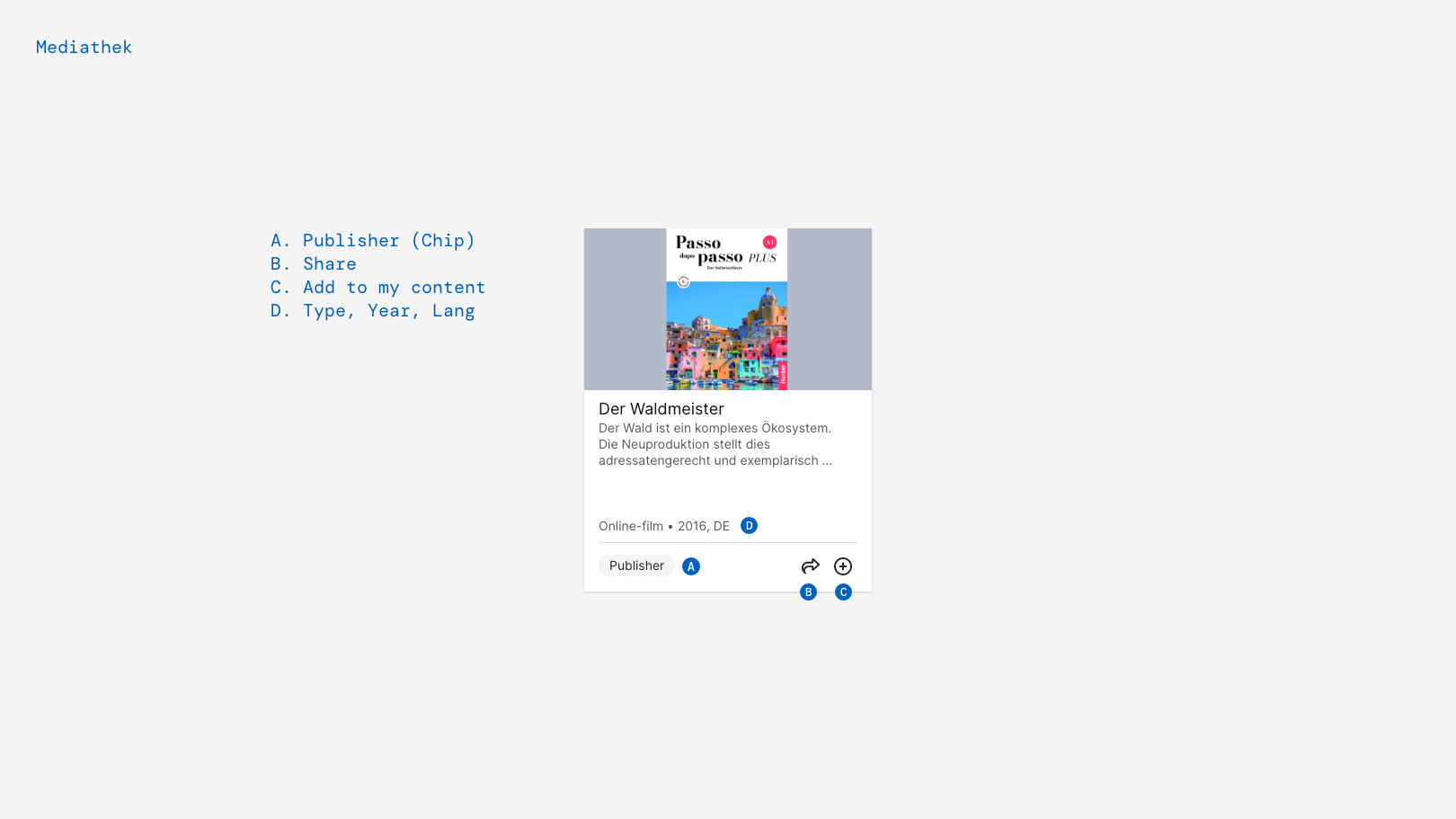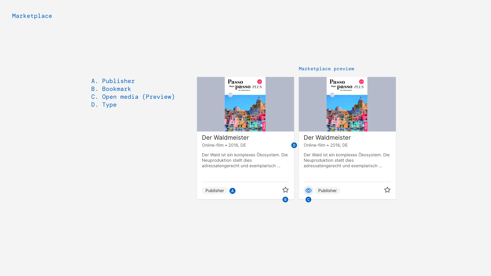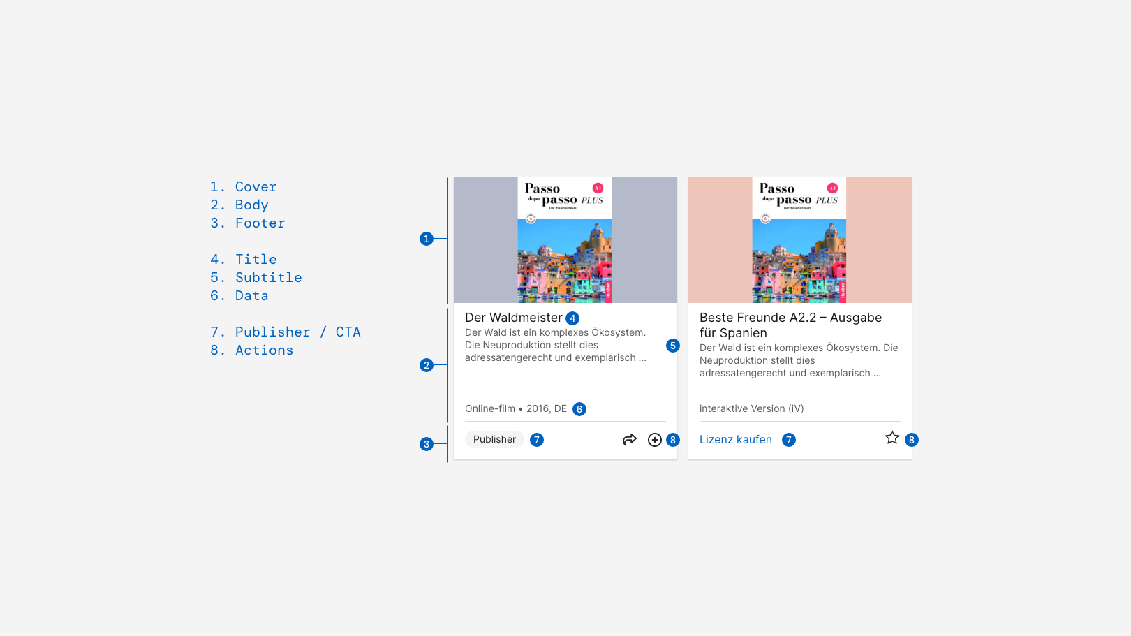 Media cards are the core components of the Edupool UI. All content lists — for example "my content", search results, content of a media list, etc. — display individual items as a card. There are several variants of the media card. Sharing the same architecture, each one contains context-specific information and actions. The overview on this page shows the current designs.