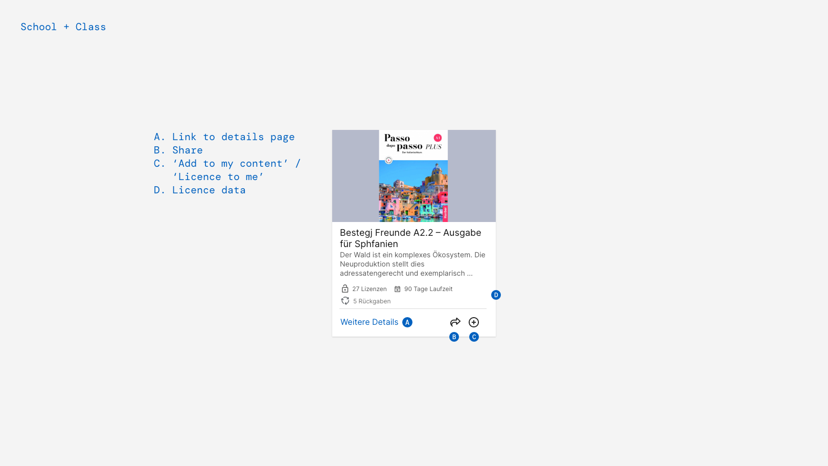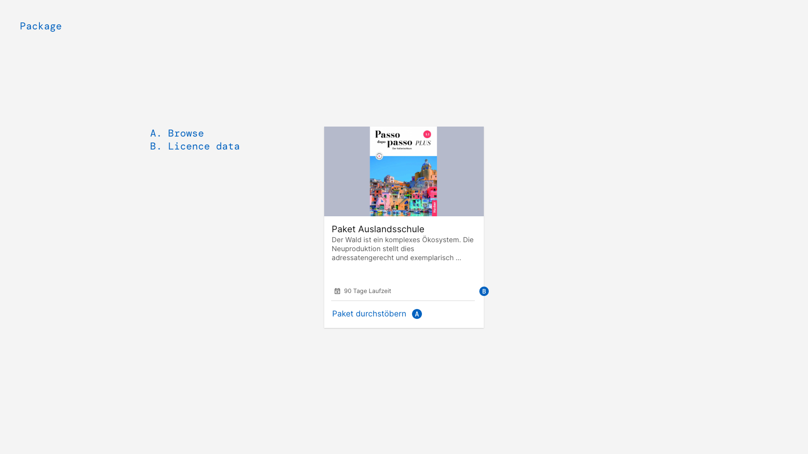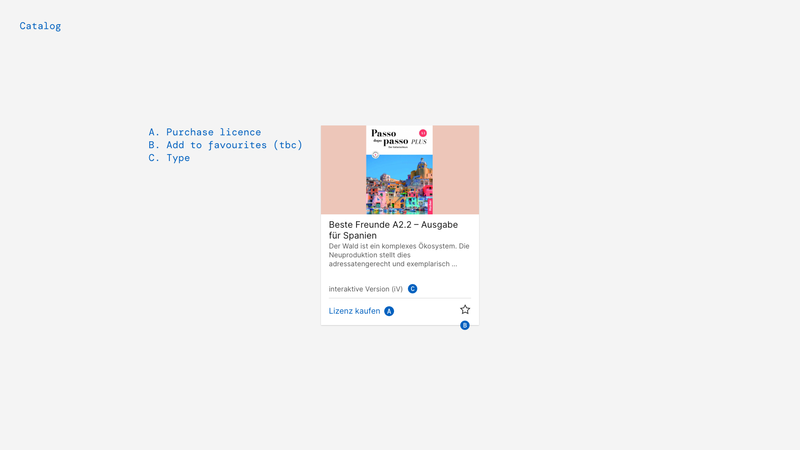 Catalog appears in single-publisher Edupool instances, such as Hueber. The catalog contains all the content published by the publisher. Users can purchase a licence from the publisher.