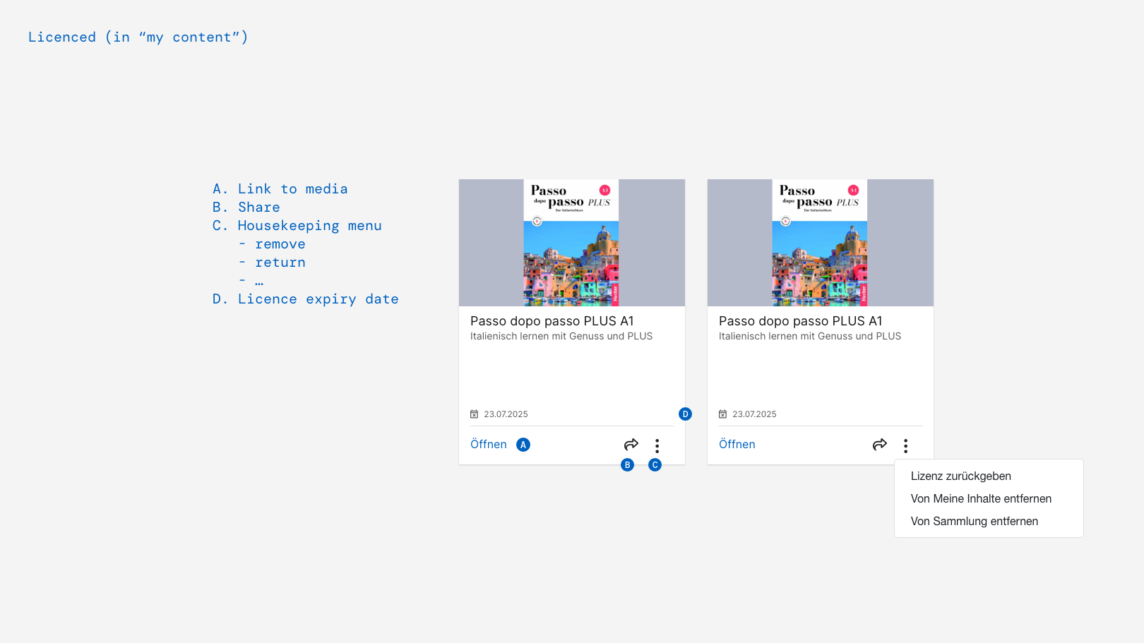 When a media is licenced to the current user, it is also available for play-out. The media is represented in all contexts by the "licenced" card.